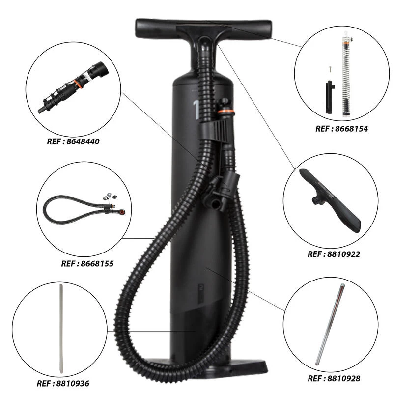 En plus de son embout de base pour gonfler à haute pression pour les kayaks en drop stitch, la pompe est livrée avec :