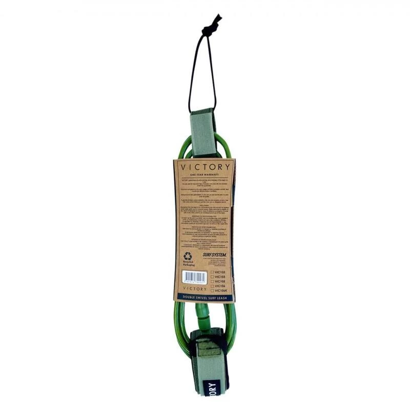 VICTORY – Longboard Leash Regular 9′ – Mat Green • Urethane 7mm haute qualité • Nouveau stainless steel ‘swivels’ (emerillons) aux 2 extremités • Rail saver détachable avec poche à clé. • Ficelle